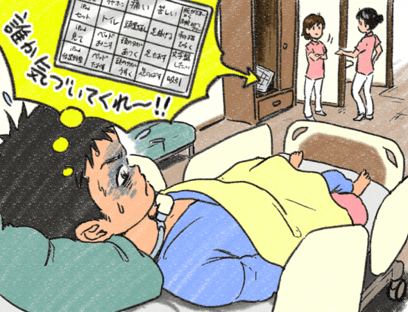 ですが、それすらほとんど使ってもらえませんでした。声も出せず、目以外ほとんど動かせない自分と、積極的にコミュニケーションをとってくれようとした看護篩さんは、ほとんどいませんでした。ある程度想像していたものの、ここまでとは思いませんでした。