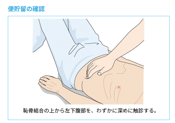 皮下脂肪が少ない場合は、便の貯留部位が膨隆して視診できる場合があります。恥骨結合直上から左側腹部にかけてよく視診します。