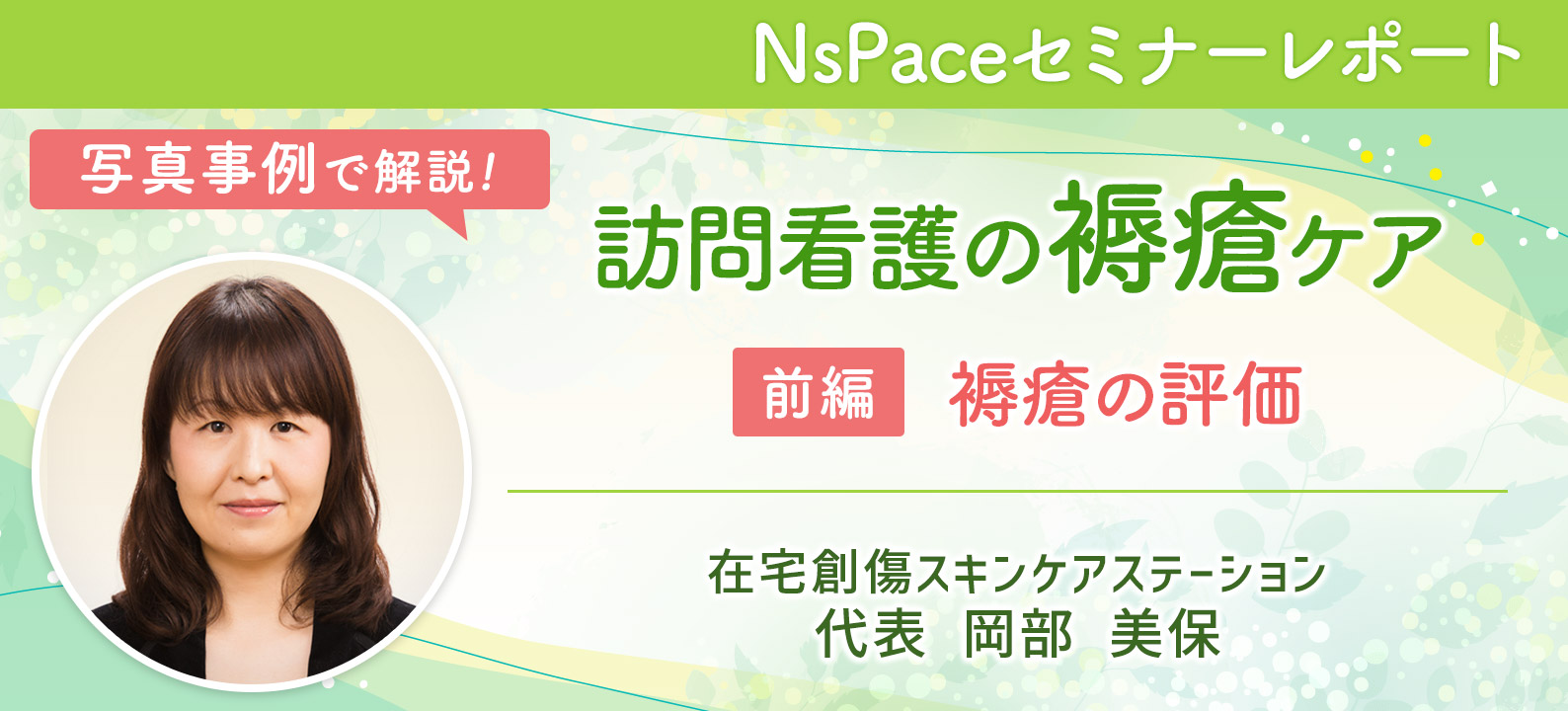 2023年2月10日に開催されたNsPace(ナースペース)のオンラインセミナー「写真事例で解説!訪問看護の褥瘡ケア」。在宅創傷スキンケアステーションの代表で、皮膚・排泄ケア認定看護師でもある岡部美保さんを講師としてお迎えし、褥瘡の評価やケアのポイントについて、実際の事例を交えながら教えていただきました。